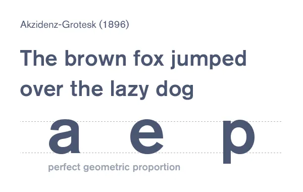 Akzidenz-Grotesk 起于1896年,受到很多字體的影響,從Baskerville, Garamond和Carlson中繼承了幾何比例的影響,將其發(fā)展到了新的一級(jí)。當(dāng)代的Akzidenz-Grotesk字體遺傳于20世紀(jì)50年代后期,它已經(jīng)是被擴(kuò)大后的字體族,這些風(fēng)格到后來啟發(fā)了更加現(xiàn)代的Helvetica,和Univers。
