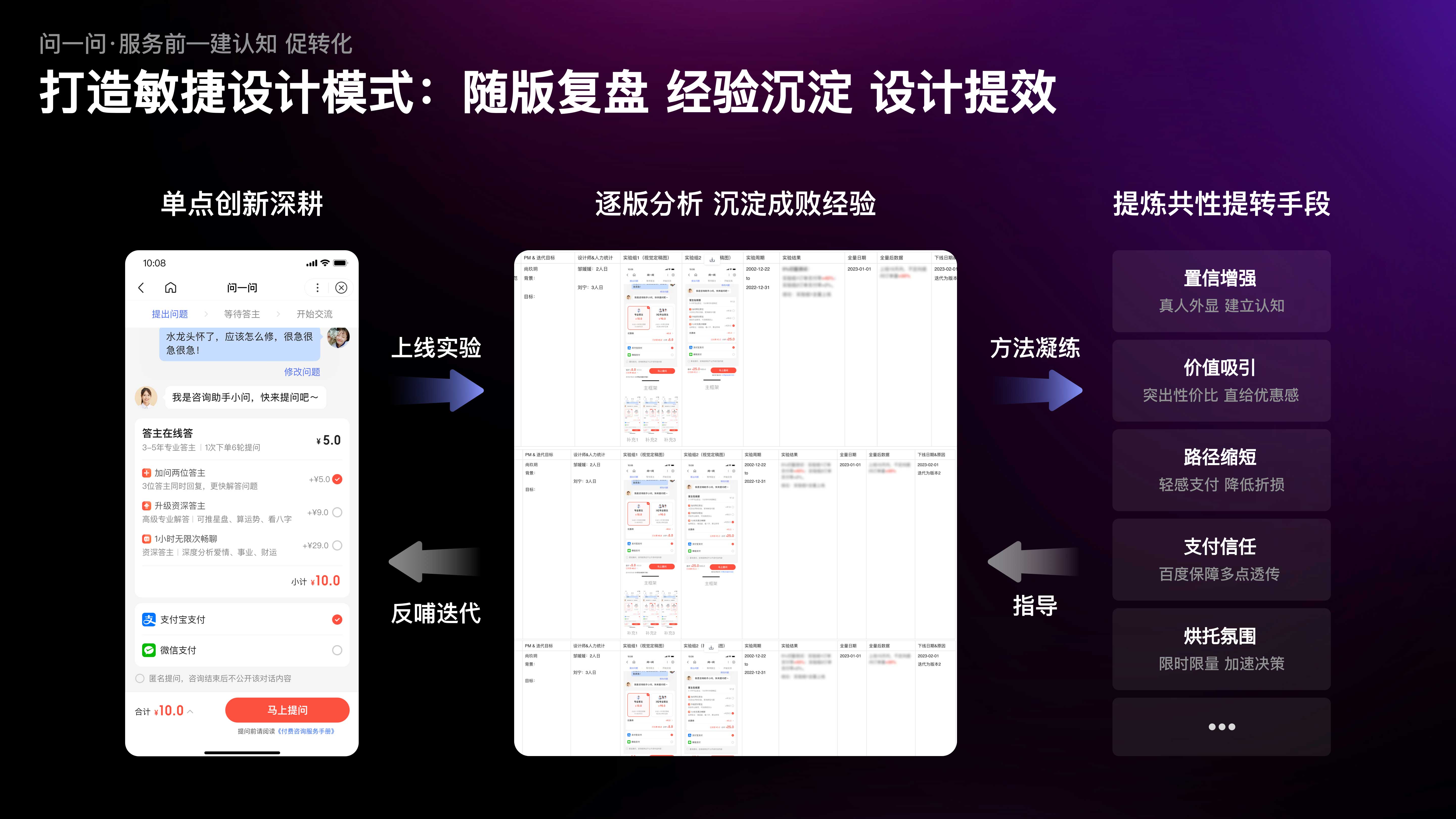 ?為了進一步提升設計效率,我們將提問頁的迭代歷史進行線上化記錄,并組織團隊定期復盤總結,提煉出「真人外顯-增強置信感」「優惠直給-突出性價比」「路徑縮短-弱化支付感」等一系列通用的提轉手段;又將這些手段復用到服務上下游環節的同類場景中,通過系統化提轉,有效幫助業務訂單量、GMV大幅提升。