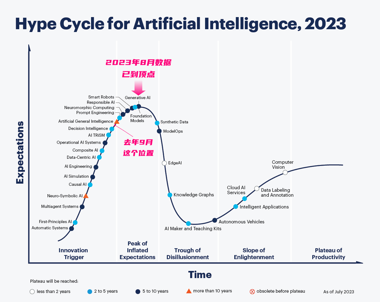 去年9月份,「Gartner」就預測生成式AI已經進入期望膨脹高位,到2023年8月「Gartner」剛發布人工智能技術成熟度曲線,生成式AI從技術萌芽期到技術膨脹期的頂峰,跟過去一段時間AI在學術、產業、資本領域的爆火完全呼應。