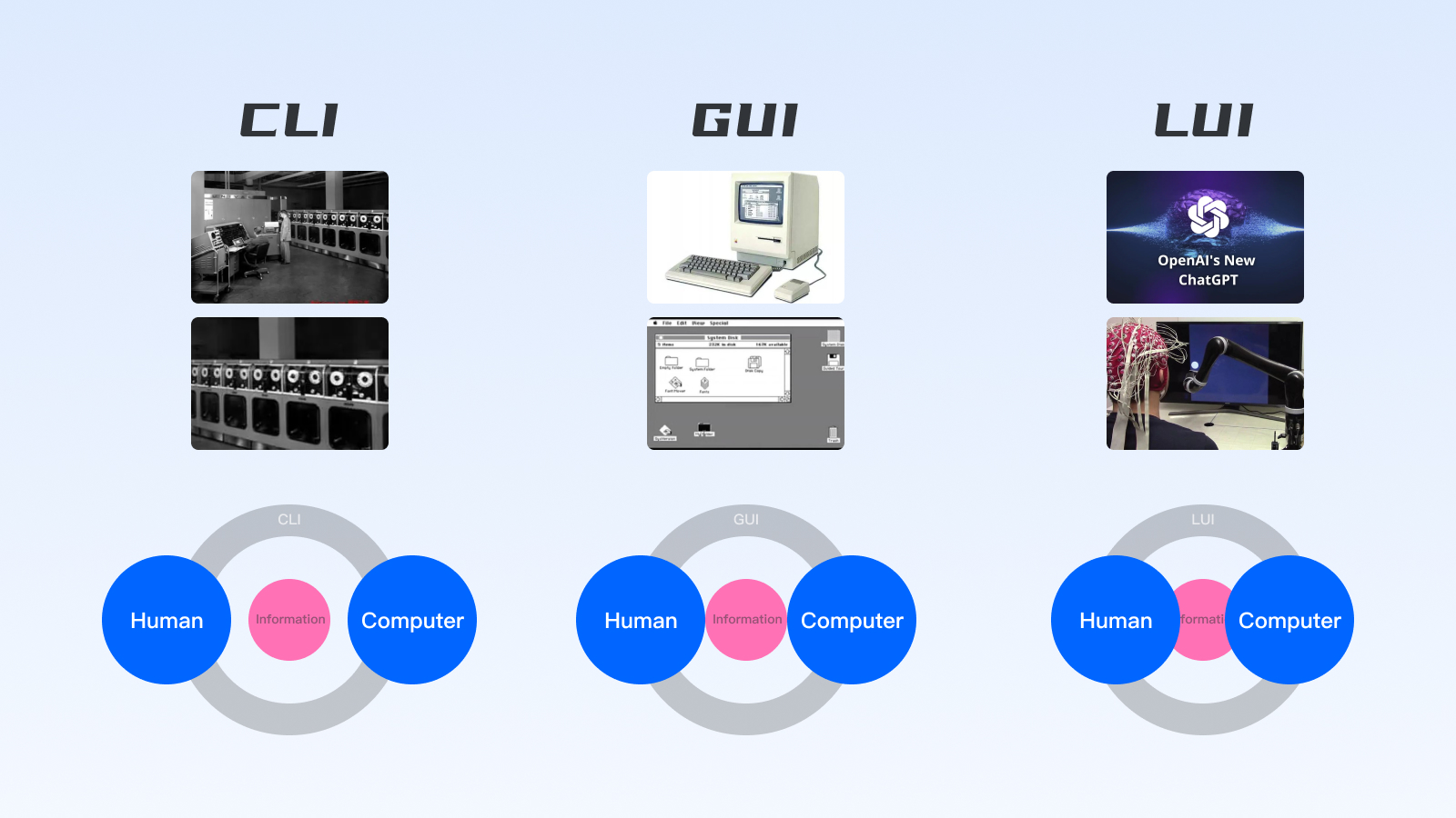 界面交互的需求繁榮得益于圖形交互的興起和市場的發展,從CLI(命令行)→GUI(圖形交互)→LUI(自然語言交互),對設計服務的要求自然不同: