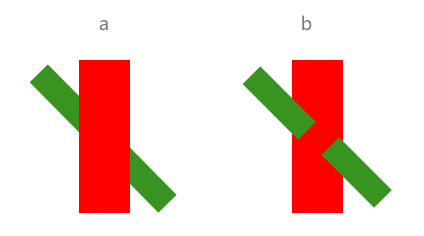 連續(xù)原則 和閉合原則有些類似。以實(shí)物形象上的不連續(xù)使瀏覽者產(chǎn)生心理上的連續(xù)知覺。看到a圖,瀏覽者會(huì)認(rèn)為是一個(gè)綠色條和一個(gè)紅色相交,而事實(shí)卻是b圖。