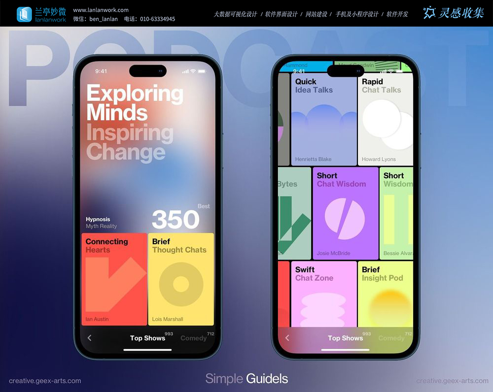 這是一款色彩鮮明的播客或內容推薦應用,采用大膽的撞色和模塊化布局。
