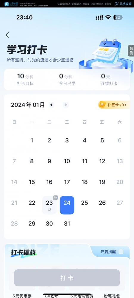 - 界面特點:淺藍色為主色調,搭配卡通日歷插畫,營造輕松的學習氛圍;底部 “打卡” 按鈕和獎勵預覽,提升用戶參與感。