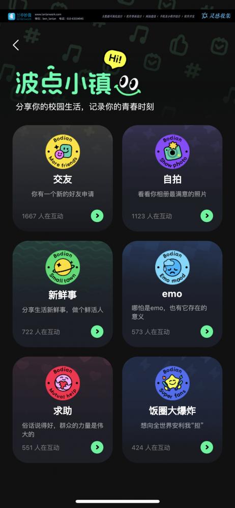 - 核心設計亮點:用不同顏色和圖標劃分 “交友”“自拍”“新鮮事” 等興趣板塊,每個板塊顯示實時互動人數,激發用戶參與欲。