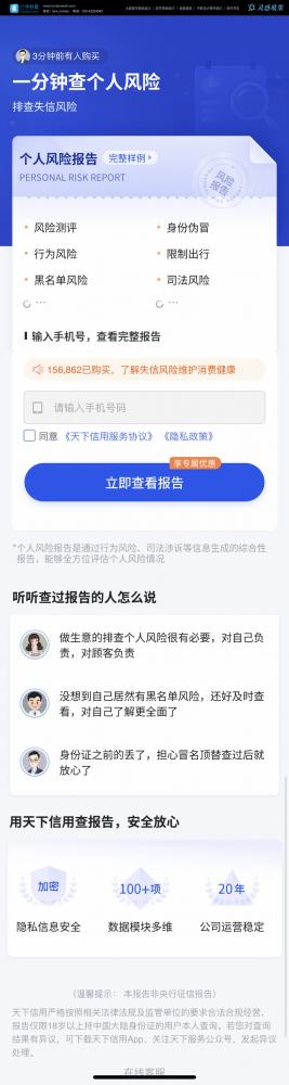 - 核心設計亮點:用藍色主調建立信任感,頂部突出 “一分鐘查個人風險” 的核心賣點,下方用戶 testimonials 增強說服力。