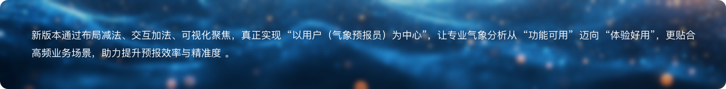 我們分析用戶的關鍵業務場景:在氣象預報業務中,精準、高效的網格預報分析是提升氣象服務質量的關鍵。我們在也頁面功能架構上進行信息歸類區分層級,視覺上按信息層級重新劃分模塊,保證信息高校傳遞,交互精確引導,提升用戶體驗。